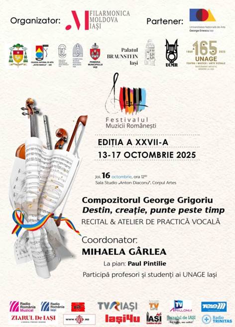 În cadrul prestigiosului Festival al Muzicii Românești, ediția XXVII, evenimentul dedicat compozitorului George Grigoriu – desfășurat în 16 octombrie 2025, ora 12:00, în sala „Anton Diaconu” a Corpului Artes – a adus în prim-plan o sinteză între cercetarea teoretică și arta interpretativă. Sub genericul Recital și Atelier de practică vocală. George Grigoriu – Destin, creație, punte peste timp, momentul a reunit studenți, cadre universitare și tineri interpreți într-un exercițiu de redescoperire a unei personalități esențiale pentru modernizarea muzicii ușoare și a jazz-ului românesc.