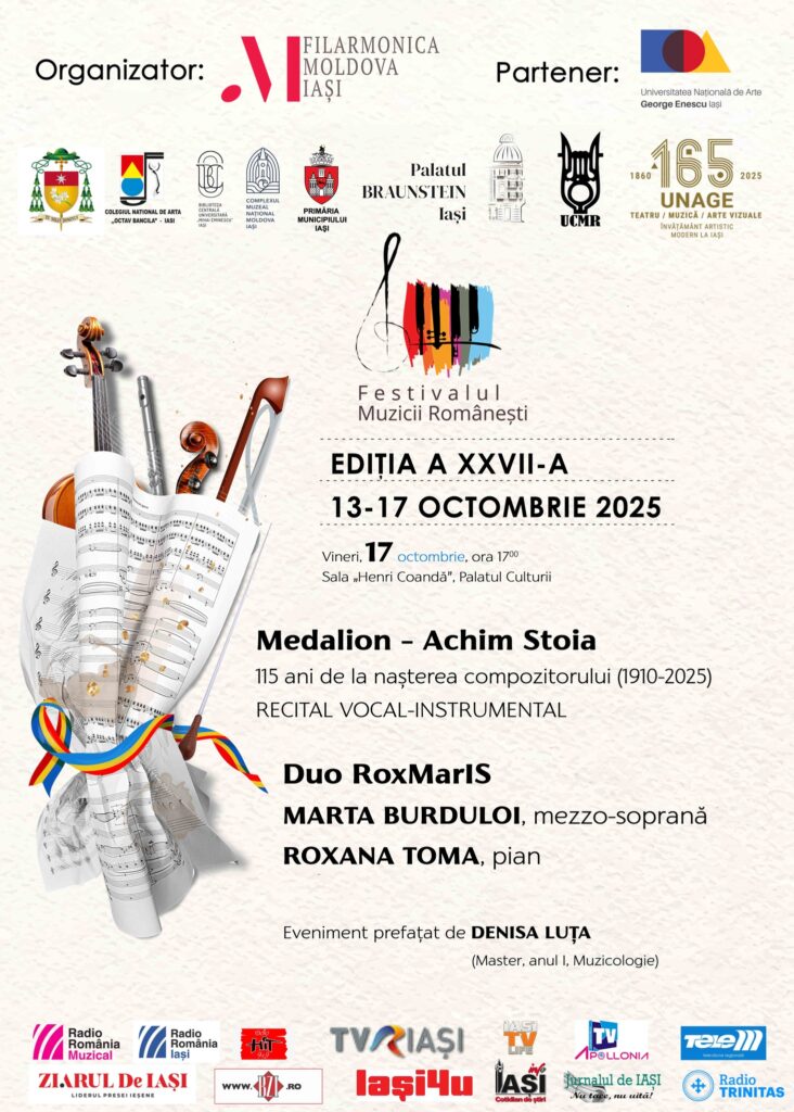 În după-amiaza zilei de 17 octombrie, ultima zi din Festivalul Muzicii Românești, Ediția a XXVII-a,compozitori, interpreți, muzicologi și iubitori ai muzicii românești s-au reunit într-un cadru deosebit, în Sala „Henri Coandă” a Palatului Culturii din Iași. Publicul restrâns s-a bucurat de atmosfera agreabilă pe care au generat-o sonoritățile liedurilor incluse în programul recitalului intitulat Medalion – Achim Stoia. 115 ani de la nașterea compozitorului (1910-2025).