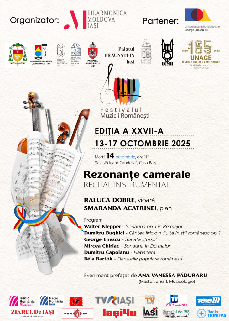 Pe 14 octombrie 2025, în cea de-a doua zi a Festivalului Muzicii Românești, aflat la ediția XXVII, publicul meloman a fost întâmpinat, în sala „Eduard Caudella”, cu un recital cameral de o rafinată expresivitate. Intitulat sugestiv Rezonanțe camerale, evenimentul a oferit o pătrundere sonoră în universul compozitorilor români din secolul XX, propunând o selecție inspirată de lucrări care armonizează lirismul folcloric cu modernitatea limbajului muzical european.