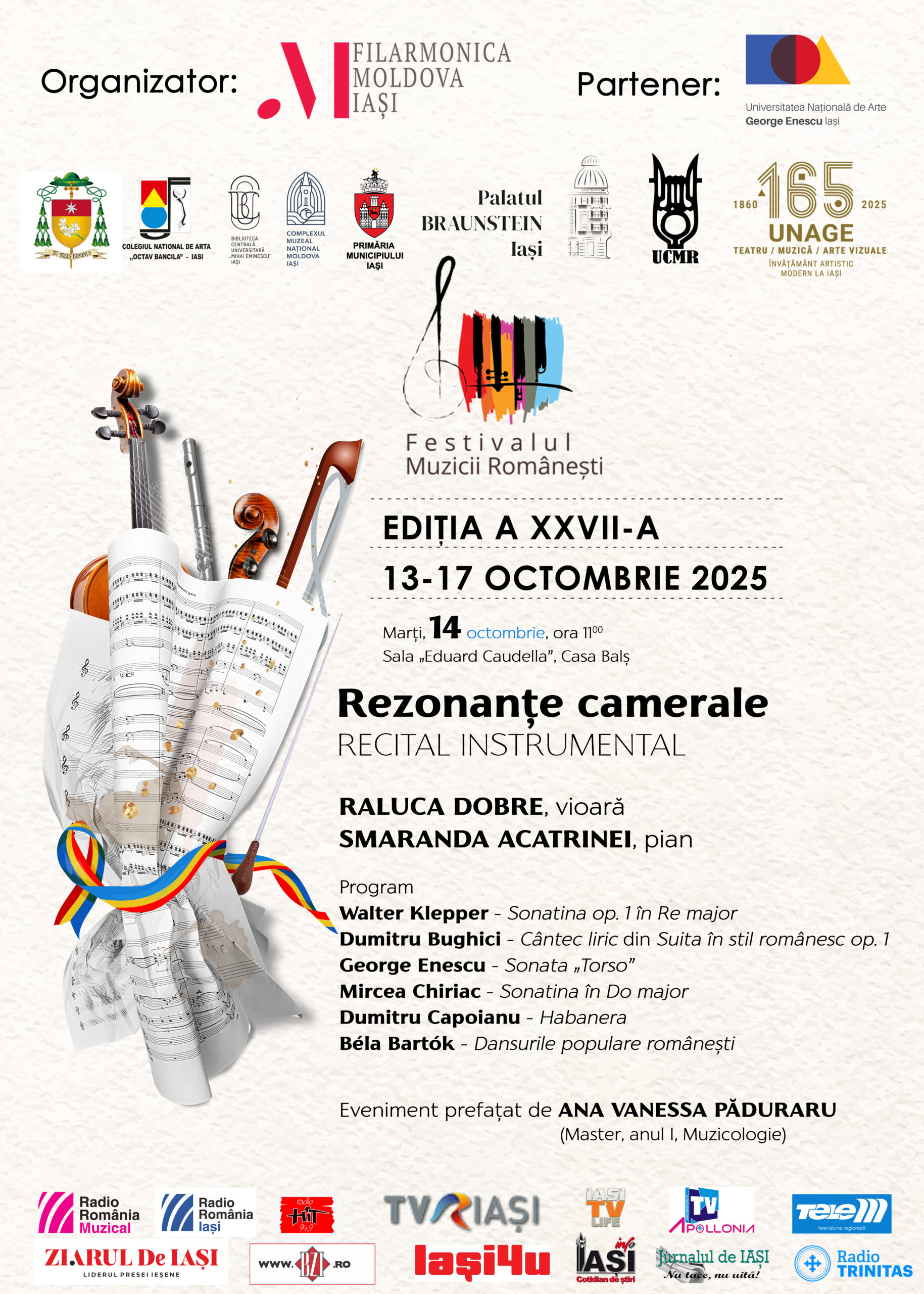 Pe 14 octombrie 2025, în cea de-a doua zi a Festivalului Muzicii Românești, aflat la ediția XXVII, publicul meloman a fost întâmpinat, în sala „Eduard Caudella”, cu un recital cameral de o rafinată expresivitate. Intitulat sugestiv Rezonanțe camerale, evenimentul a oferit o pătrundere sonoră în universul compozitorilor români din secolul XX, propunând o selecție inspirată de lucrări care armonizează lirismul folcloric cu modernitatea limbajului muzical european.