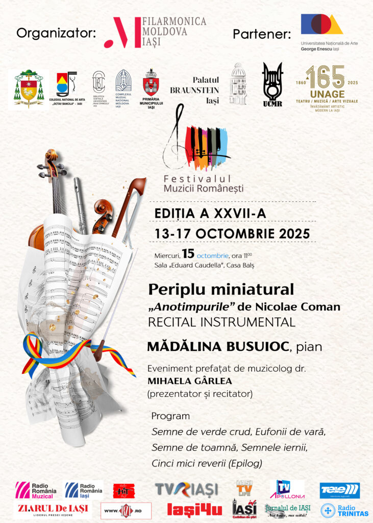 Acest Periplu miniatural imaginat de compozitorul Nicolae Coman a prins viață sub arcuirea degetelor, simțurilor și trăirilor pianistei Mădălina Busuioc, lector universitar doctor la Facultatea de Interpretare, Compoziție și Studii Muzicale Teoretice, alături de partenera sa de scenă, doamna conferențiar universitar doctor Mihaela Gârlea.