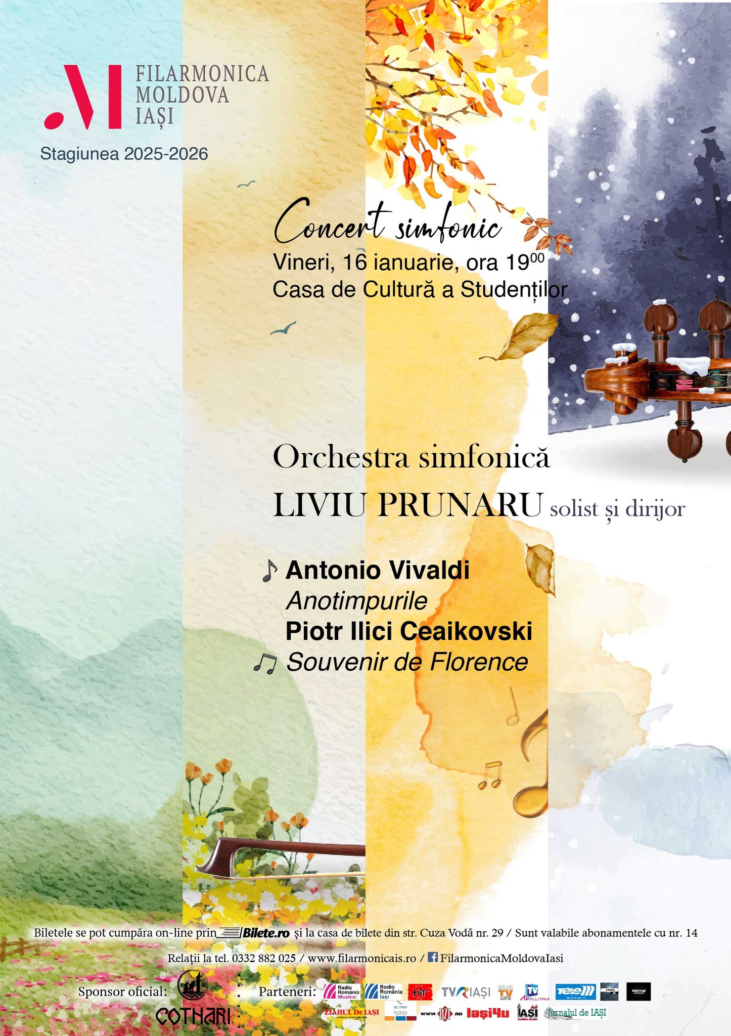 Cel mai recent concert al Filarmonicii „Moldova” Iași, din 16 ianuarie 2026, a adus ceva neobișnuit pentru spectacolele de fiecare vineri seara. Maestrul Liviu Prunaru a prezentat Anotimpurile de A. Vivaldi și Souvenir de Florence al lui P. I. Ceaikovski dintr-o triplă postură: solist, concert-maestru și dirijor. O combinație îndrăzneață, dar afirmăm fără ezitare: reușită! Maestrul Prunaru a dat un suflu proaspăt secției de coarde, o calitate sonoră cum poate numai în marile săli de concerte din Europa se poate auzi. Comparând concertul din această seară cu celelalte ale Filarmonicii din cel puțin ultimii ani, nu putem trece cu vederea noul sunet mai cald, mai legat, mai expresiv al orchestrei, fie ea numai de coarde. Interpreții au demonstrat și o omogenitate demnă de o sală plină, așa cum a fost vineri seara.